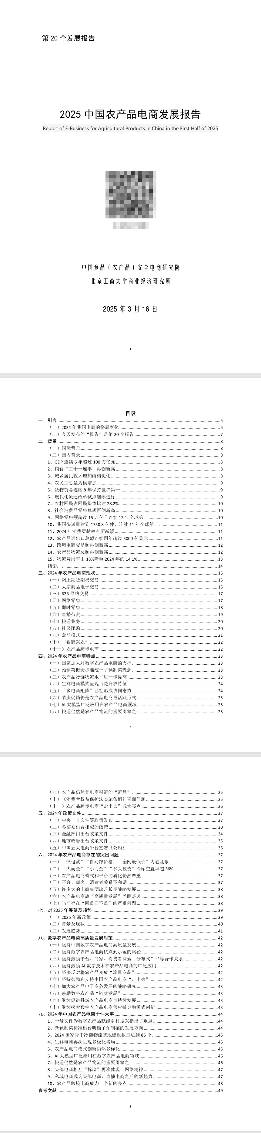 3月16日,“2025中国农产物电商高层研讨会”正在工商大学举行,会上,工商大学贸易经济研究所所长洪涛传授,代表中国食物(农产物)平安电商研究院发布了《2025年中国农产物电商成长演讲》,是第20个成长演讲。《演讲》采纳“引言、布景、现状、特征、政策、问题、趋向、对策、年度十件大事”9个方面的内容框架,构成独具特色的《2025中国农产物电商成长演讲》。《演讲》指出,2024年中国农产物电商超额完成了地方网信办、农业农村部、国度成长委、工业和消息化部、国度村落复兴局结合印发《2024年数字村落成长工做要点》的方针,出格是跨越“农产物电商收集零售额冲破6300亿元”的方针,同比增加15。8%,持续三年跨越打算方针。